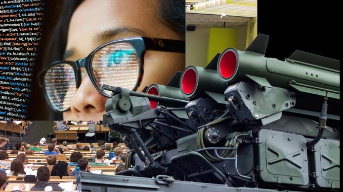 Nestas condições de pressão e restrições financeiras, as empresas de armamento e o sector militar em geral oferecem às universidades segurança económica e uma via profissional concreta para os potenciais estudantes. Esta situação é particularmente comum nas áreas STEM (ciência, tecnologia, engenharia e matemática), onde são urgentemente necessárias inovações radicais e desenvolvimentos tecnológicos acelerados para o cenário de guerra em rápida transformação. Enquanto o financiamento e os subsídios para a educação nacional são reduzidos, as despesas militares do Reino Unido disparam.[4] O sector está a investir fortemente na corrida aos armamentos, e uma fonte de mão-de-obra está prontamente acessível através dos laboratórios de investigação em todas as universidades da Grã-Bretanha.[5] Empresas como a BAE Systems, a Rolls-Royce e a Raytheon estão interessadas em explorar o trabalho intelectual dos estudantes e dos colaboradores no desenvolvimento das suas tecnologias, através de estágios de investigação, bolsas de estudo, feiras de carreiras e patrocínios.[6] Impacto e receitas cruzam-se, portanto, tornando a parceria entre a indústria de armamento e o ensino superior tão perigosa quanto mutuamente benéfica.